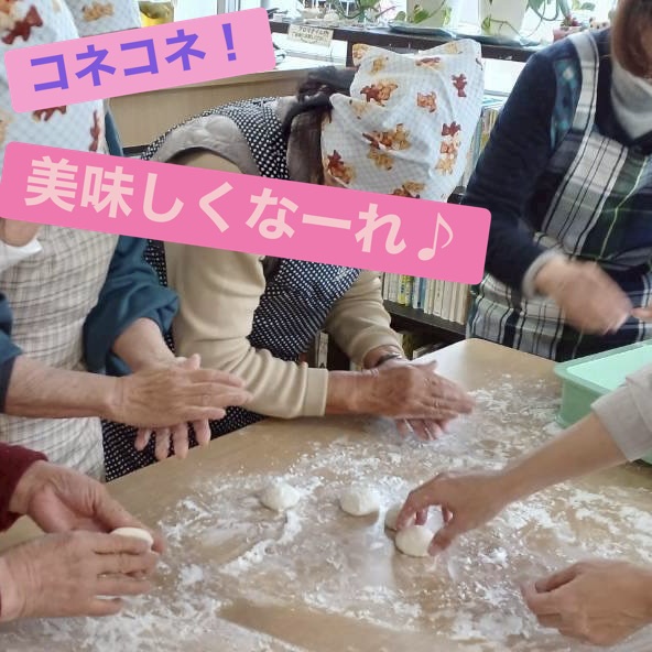 高齢者さん・リワーク利用者さん・隣の施設の子供さん・職員が集まって、老若男女、心を合わせてペッタンコしました。